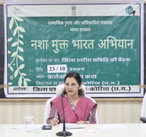 कोरिया 23 अक्टूबर 2024/ कलेक्टर श्रीमती चंदन त्रिपाठी की अध्यक्षता में आज कलेक्ट्रेट सभाकक्ष में नार्को समन्वय केंद्र (एनसीओआरडी) और समाज कल्याण विभाग द्वारा आयोजित नशा मुक्त भारत अभियान की जिला स्तरीय बैठक की सम्पन्न हुई।